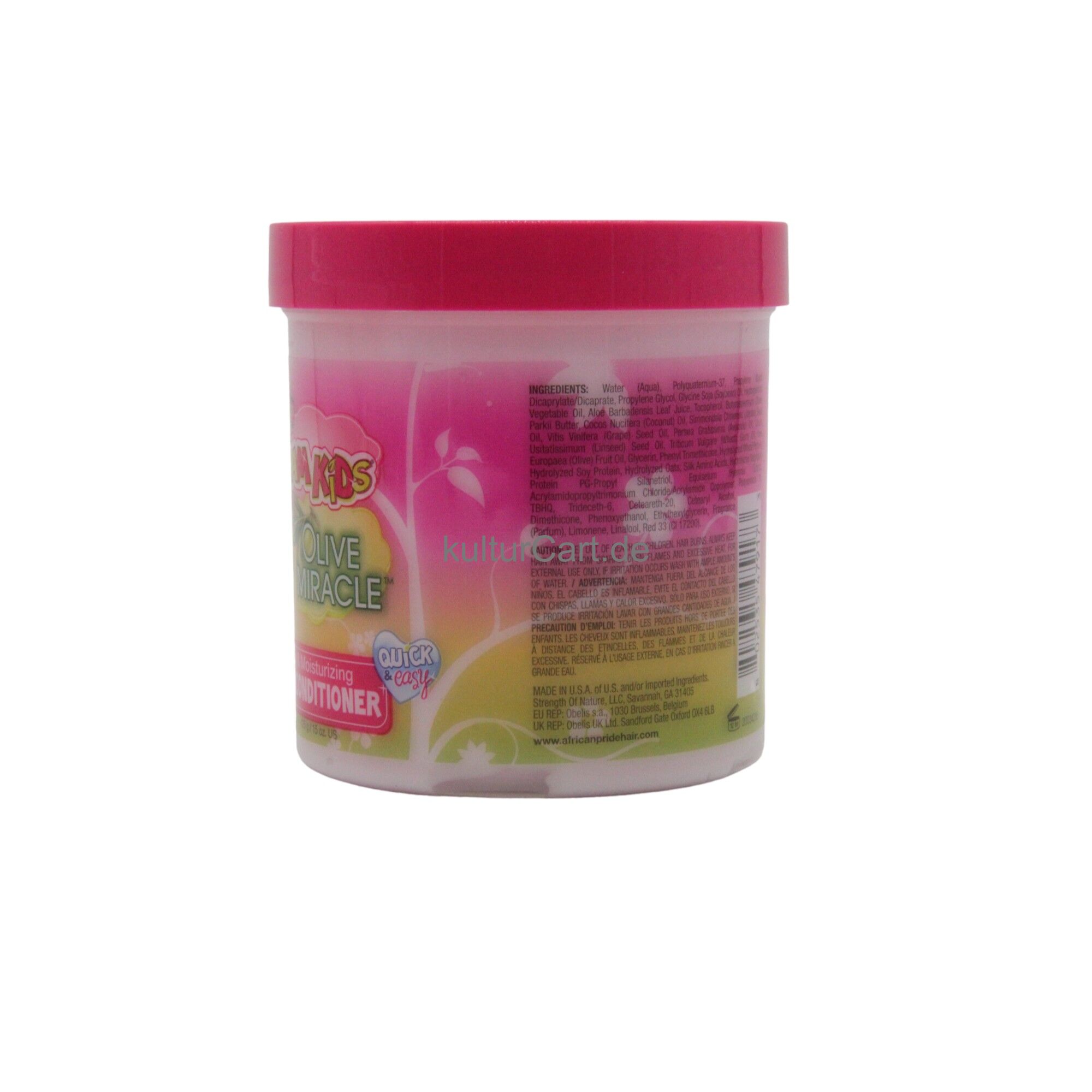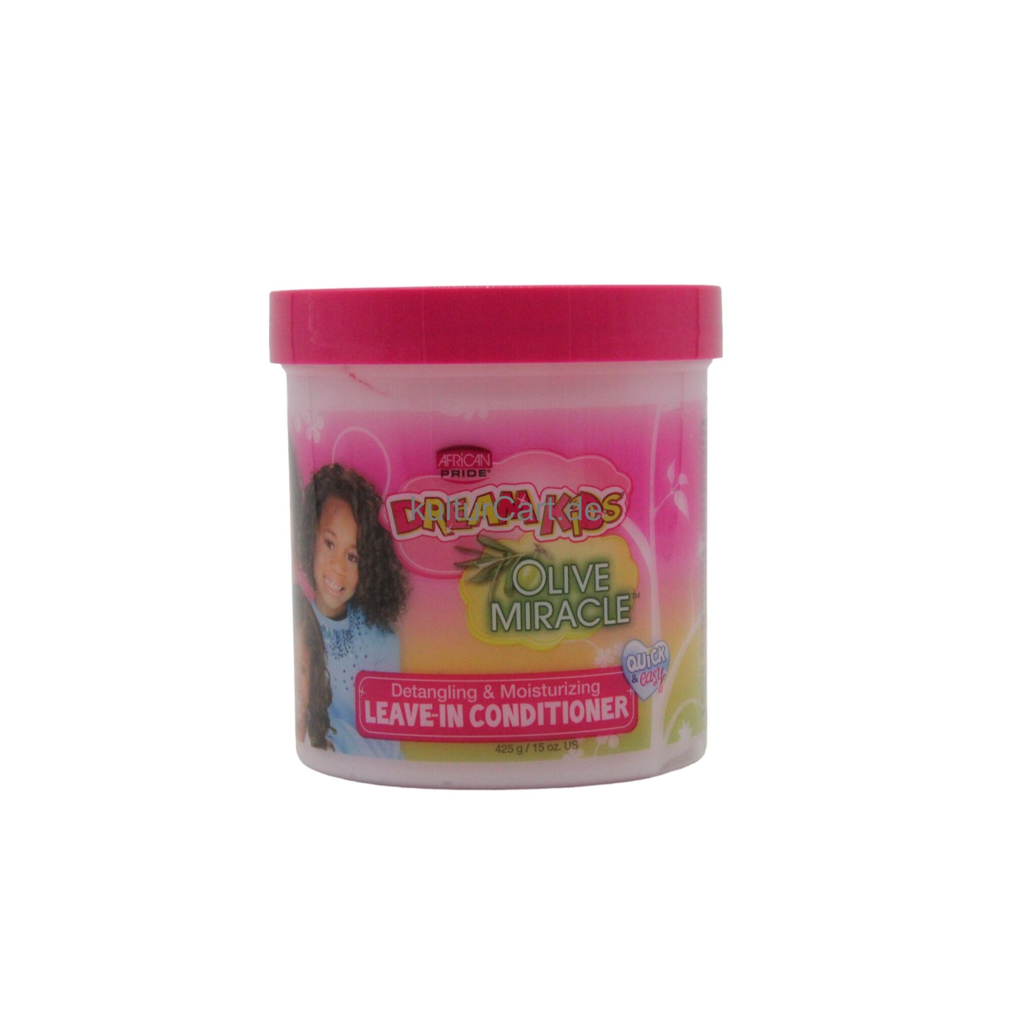 African Pride Dream Kids Olive Miracle Detangling & Moisturizing Leave-in Conditioner, in a 425g jar, provides intense moisture and detangling benefits for children's hair. This leave-in conditioner is enriched with olive oil to hydrate, detangle, and protect young hair, leaving it soft and manageable.