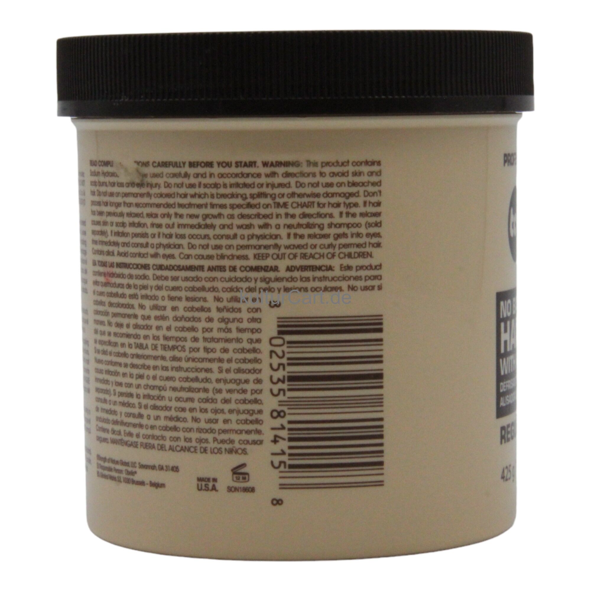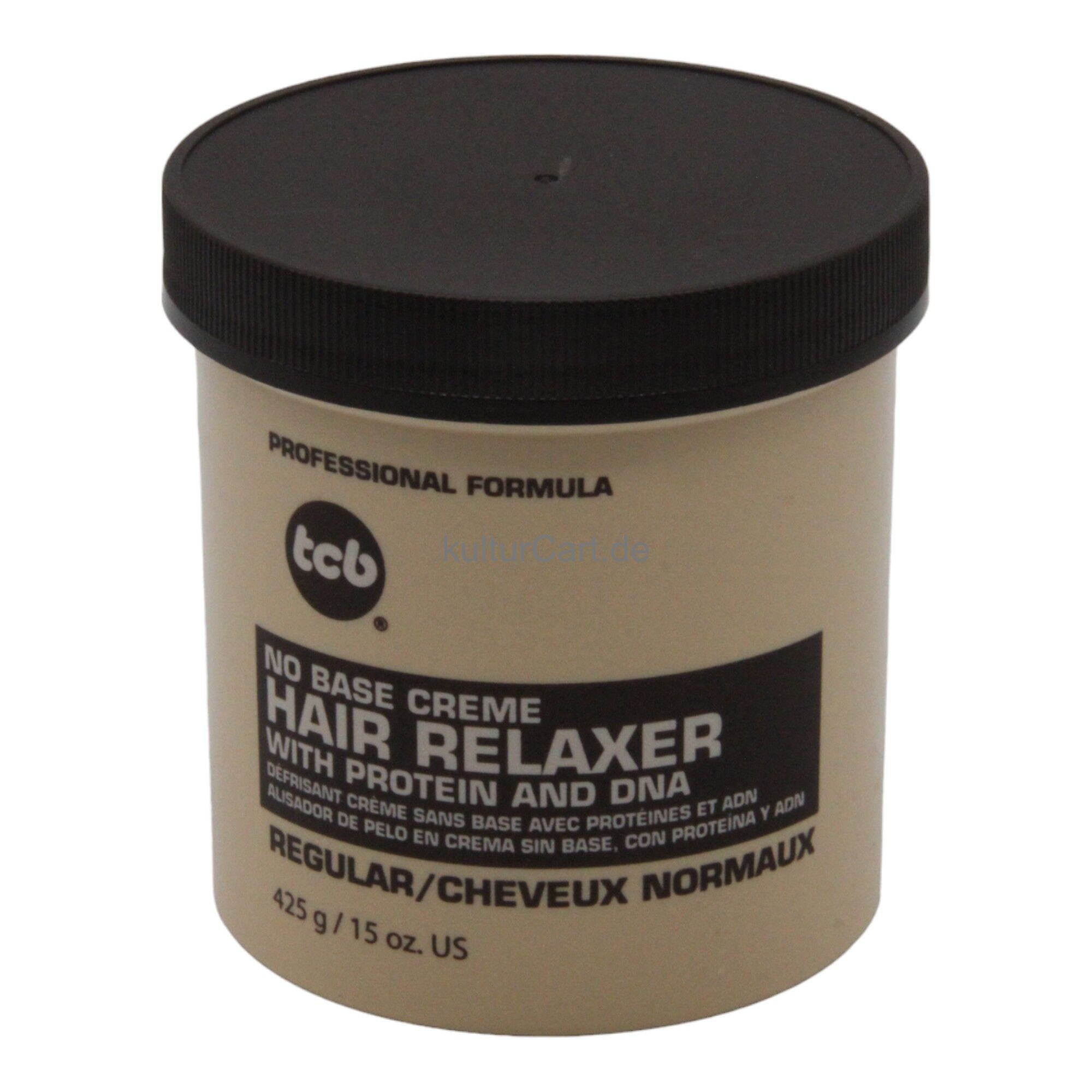 TCB No Base Creme Hair Relaxer With Protein and DNA Regular, in a 425g container, is designed to provide effective straightening while strengthening hair with proteins and DNA. This relaxer offers a no-base formula, making it easy to use and ensuring hair remains strong and healthy.