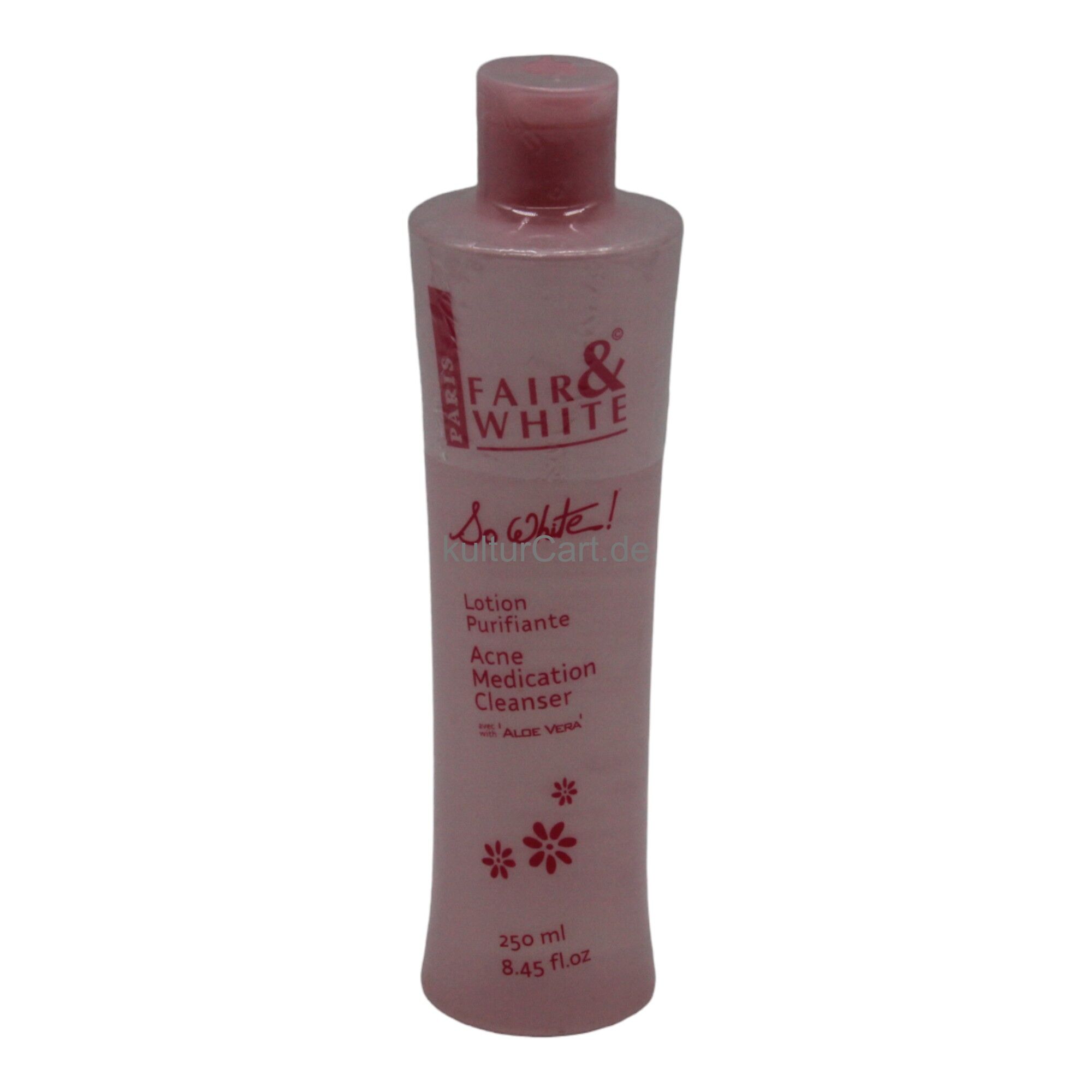 Fair & White Acne Medication Cleanser Lotion, in a 250ml bottle, is designed to cleanse and treat acne-prone skin. This medicated cleanser combines acne-fighting ingredients with soothing agents to help clear up blemishes and prevent future breakouts while maintaining skin hydration.