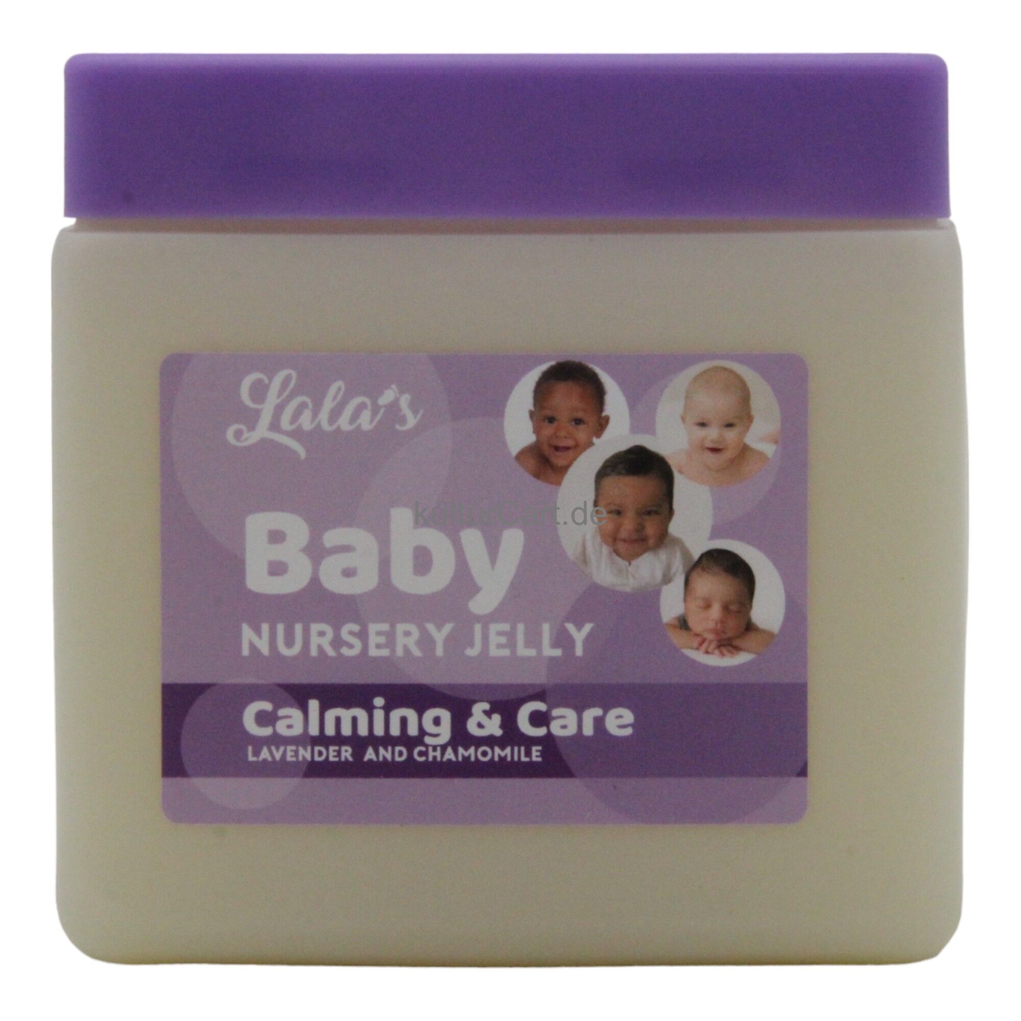 Lala's Baby Nursery Jelly Calming & Care Lavender and Chamomile, in a 368g container, provides soothing and moisturizing care for your baby's delicate skin. Infused with lavender and chamomile, this nursery jelly helps to calm and protect your baby's skin.