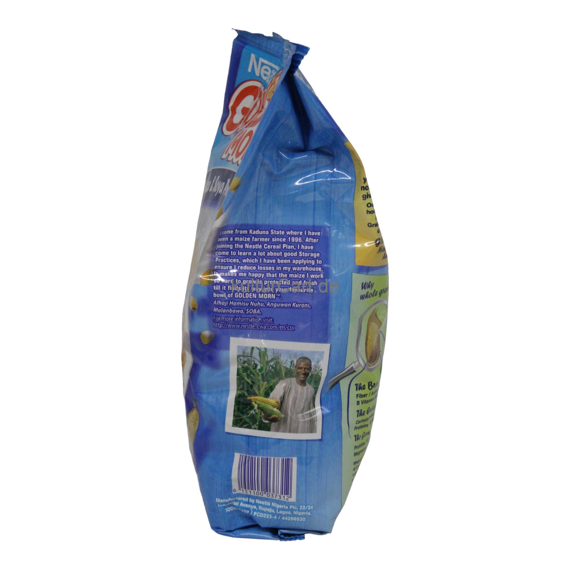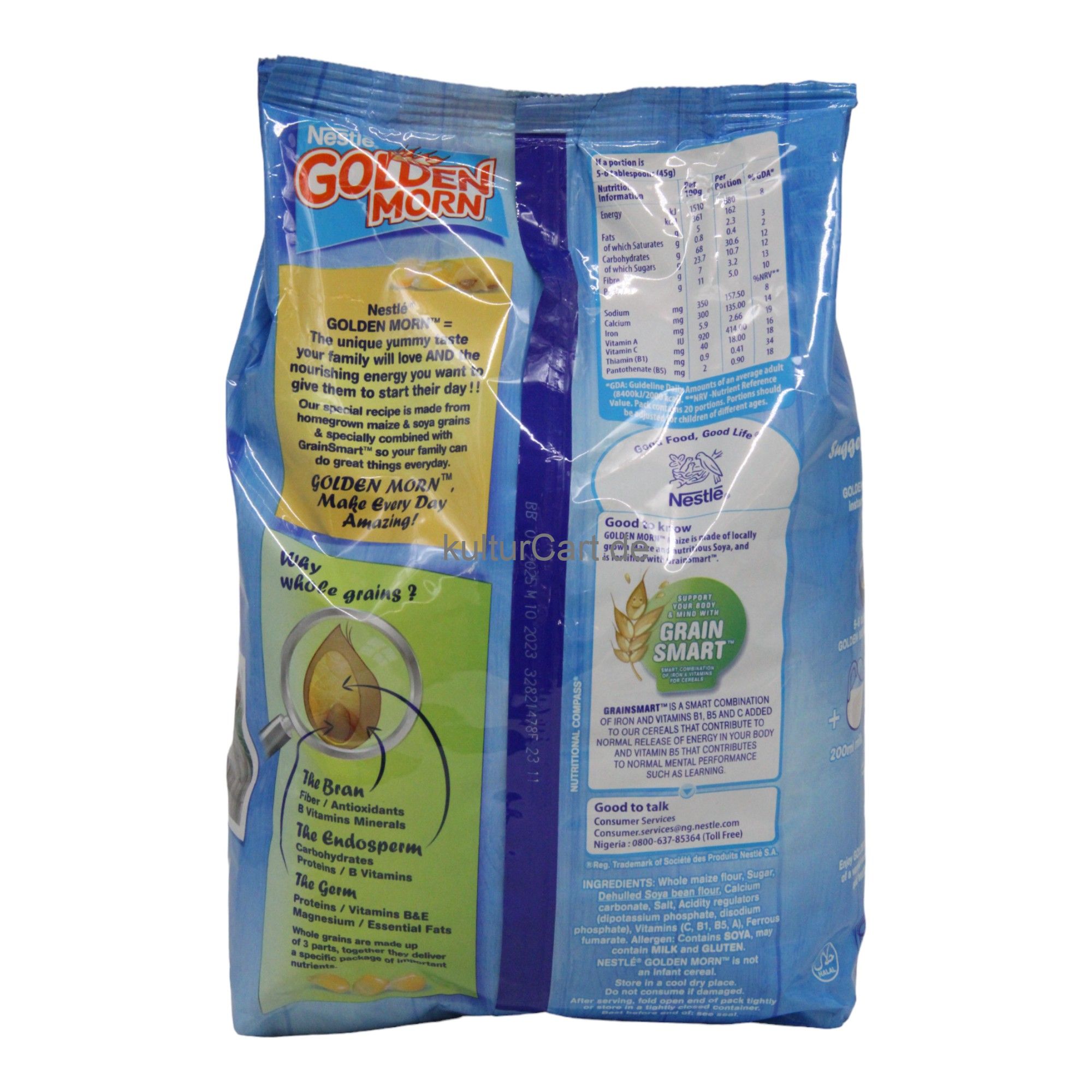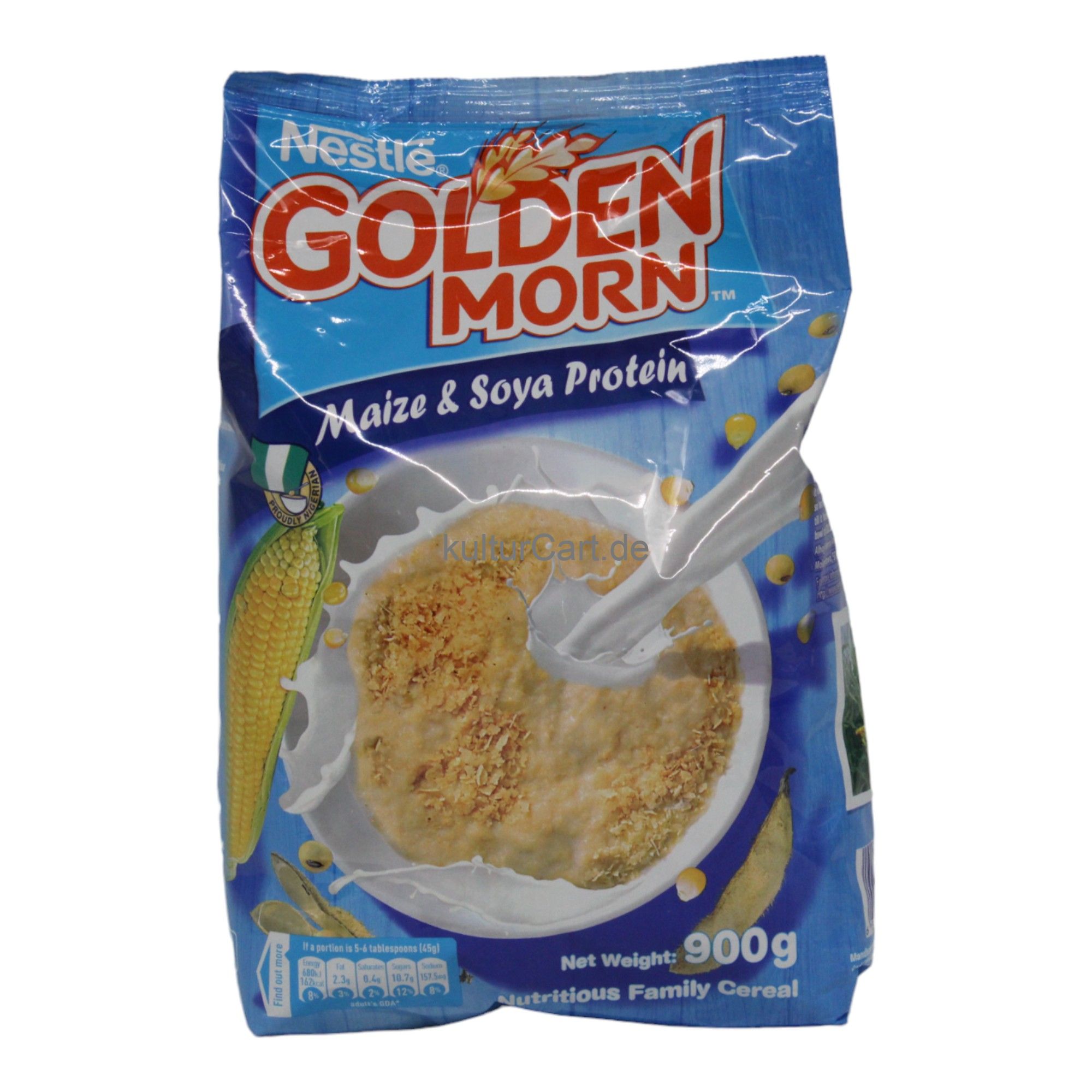 Nestle Golden Morn, in a 900g package, is a nutritious cereal made from whole corn flour, soy flour, and millet. It is rich in vitamins and minerals, providing a healthy and energizing start to the day.